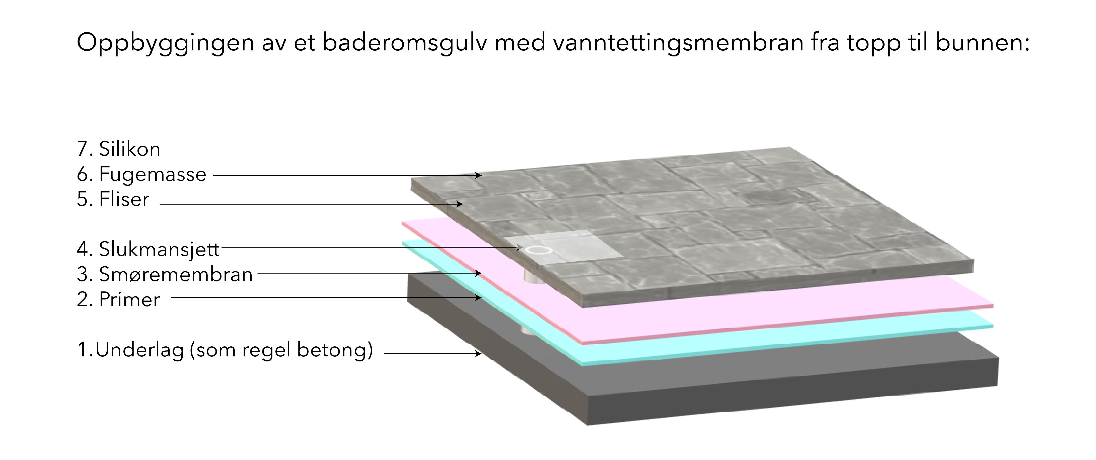 Membran på badet er et tynt lag som legges mellom veggene og flisene for å stoppe fuktigheten fra å trenge inn. Badet er utsatt for mye vann og fuktighet, og uten en effektiv barriere kan vann trenge inn i bygningsstrukturen, noe som kan føre til mugg, råte, og skader på bygningen. Membranen sikrer at vannet holder seg på overflaten og ledes bort til sluk, og beskytter dermed bygningens integritet.
